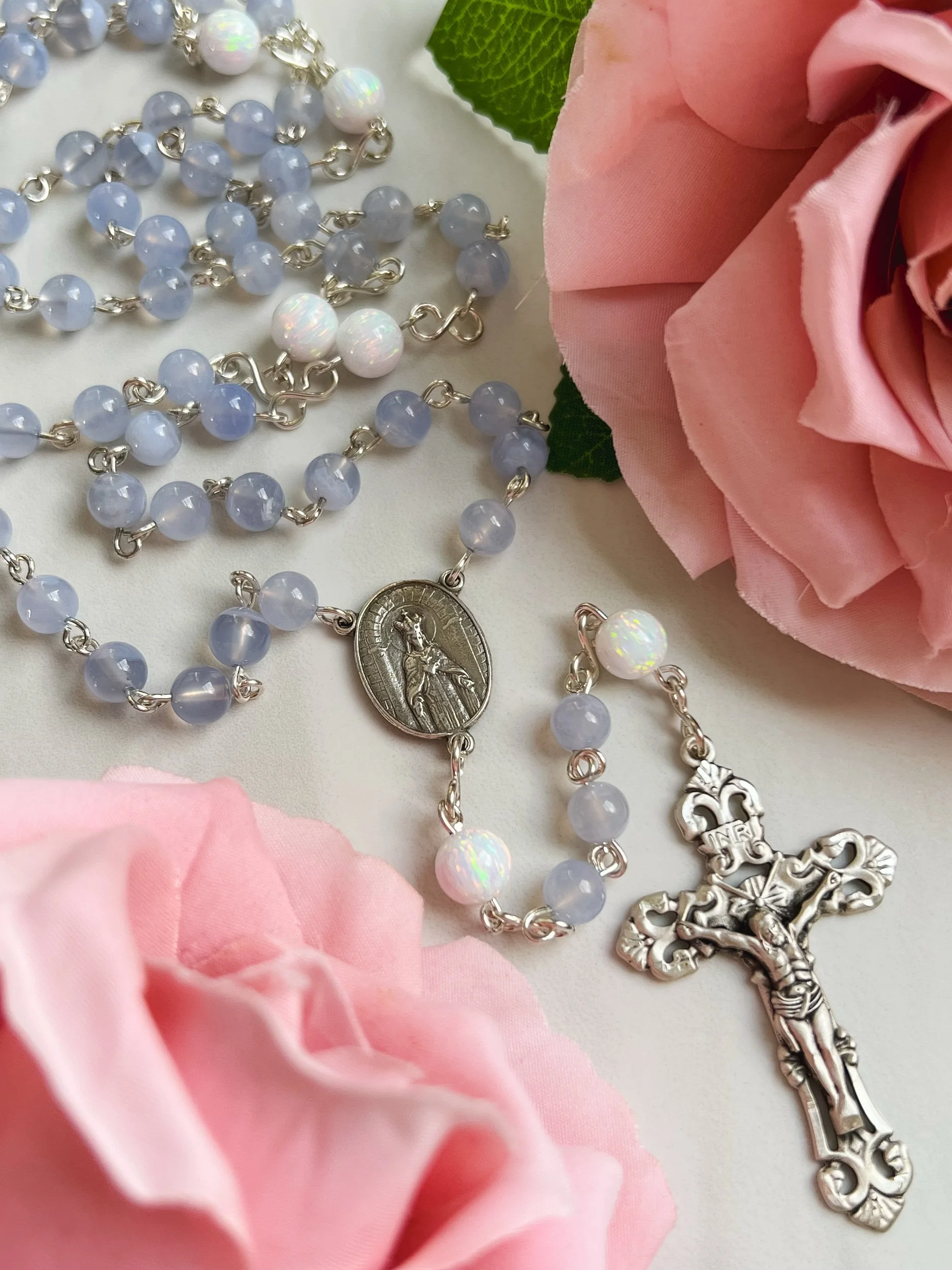 Blue Lace Agate Rosary with Our Lady of Fatima and Pardon Crucifix